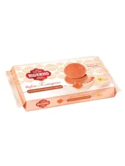 Вафли ЯШКИНО "Голландские" с нежной карамельной начинкой, подчеркивающей хрустящую структуру продукта.