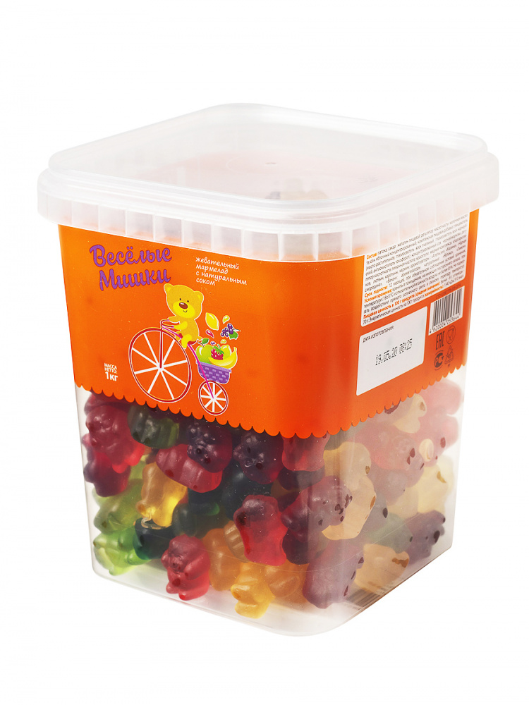 Фруктовый жевательный мармелад Веселые мишки с натуральным соком! Желейные, фигурные, в форме забавных мишек и каждый цвет имеет свой вкус - апельсин, малина, черная смородина, банан, яблоко, лимон! Жевательные Мишки от Азовской фабрики отличаются мягкостью и особой нежностью. Всегда свежие, сочные и ароматные, хорошо упаковываются перед отправкой. Цветные мармеладки отлично подойдут как подарок деткам на торжество, подарят радость вкуса,