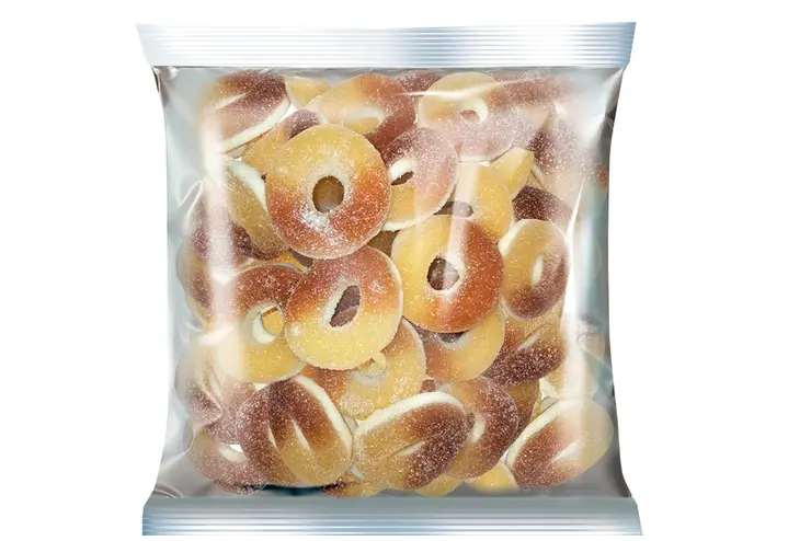 Двухслойный жевательный в форме колечек. Верхний слой – двухцветный жевательный мармелад, нижний слой продукта – воздушная пена.