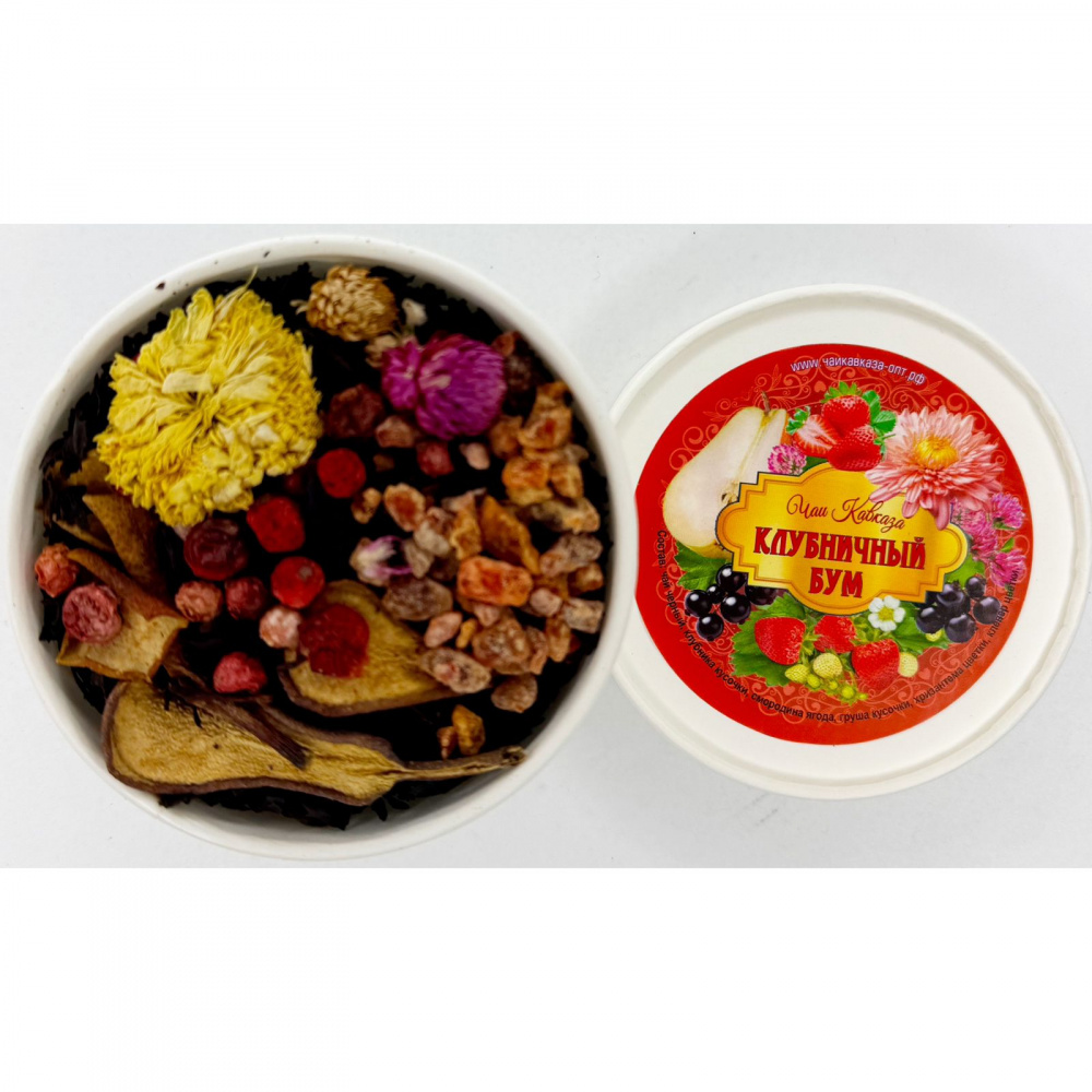 Состав: чай черный, клубника кусочки, смородина ягода, груша кусочки, хризантема цветки, клевер цветки.